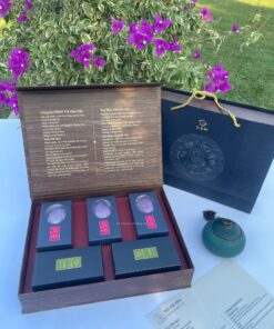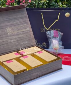 - Vỏ hộp đựng trà được làm bằng vật liệu carton lạnh có vân giả gỗ màu nâu. Hộp chắc chắn, hình thức mẫu mã đẹp, lịch sự. Kích thước hộp: 36cm*27cm*7.5cm